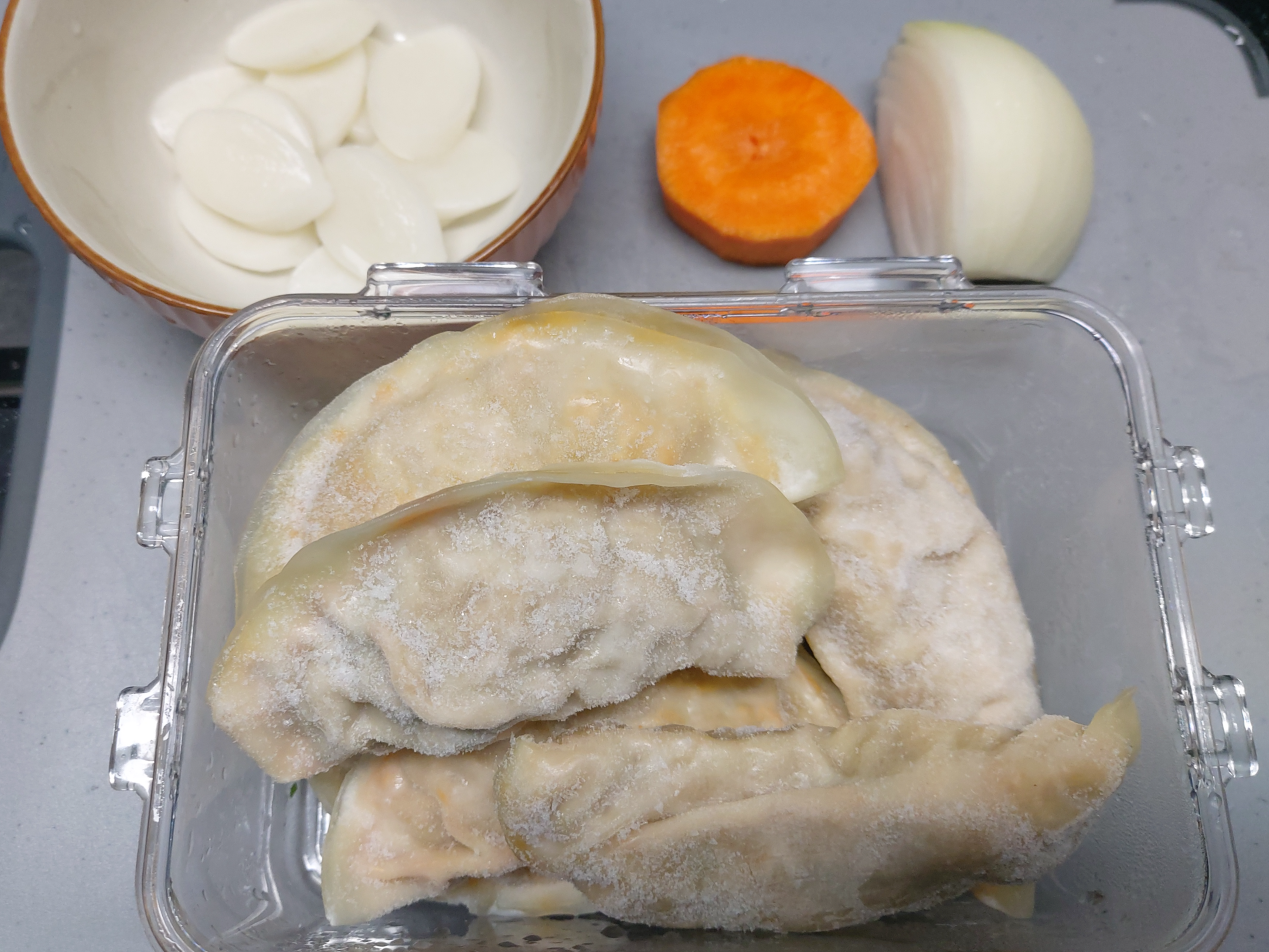 만두(대략 8개) / 떡사리(있으면 넣기) / 양파 1/4개 / 당근(있으면 넣기) / 곰탕 육수 한팩 / 물 100ml / 국간장 1스푼(T) / 멸치액젓 1/2스푼(T)