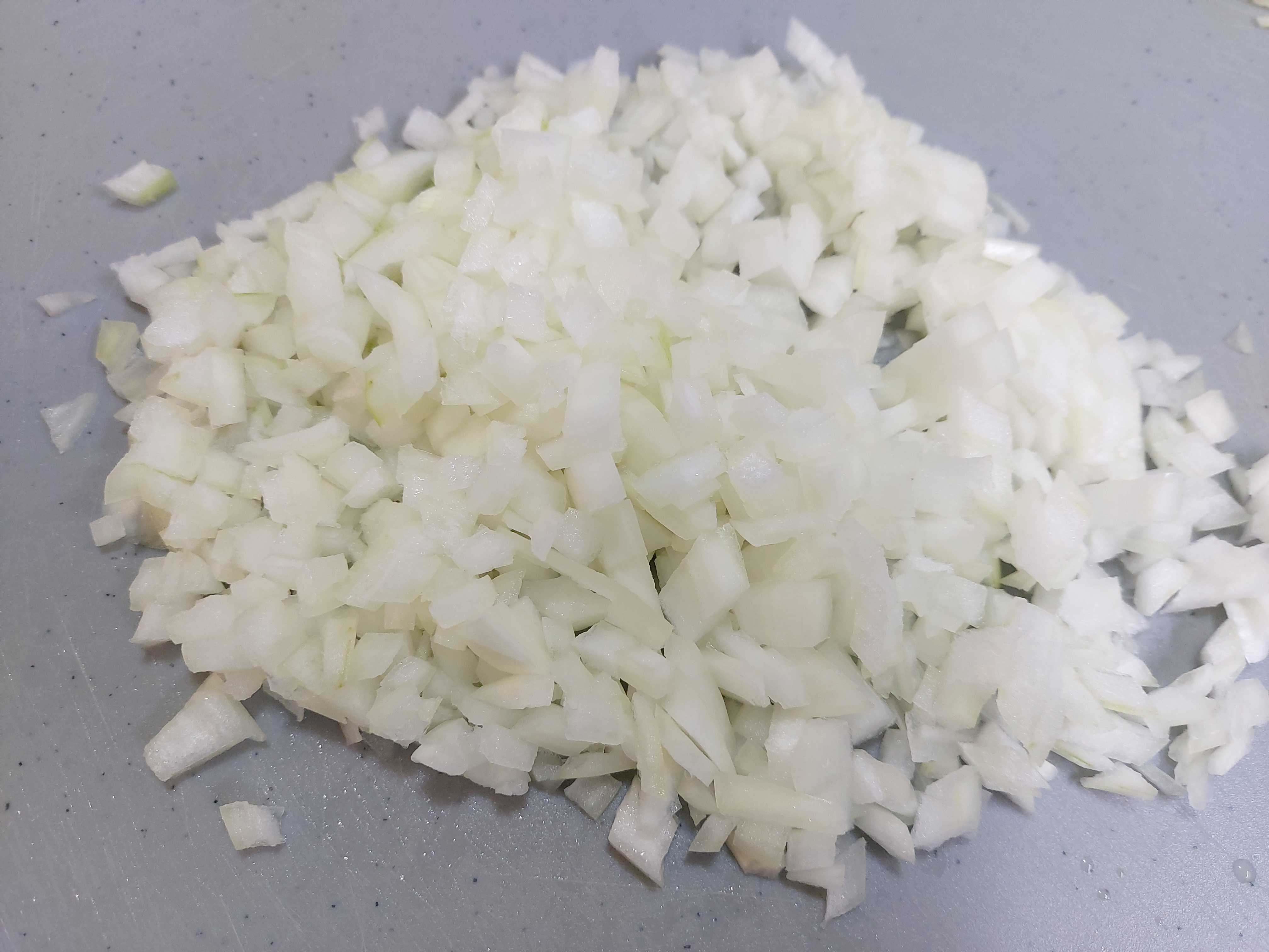 양파 1개를 잘게 다져준다. 볶으면 숨이 죽어 부피가 줄어들므로 많이 넣어줘도 괜찮다.